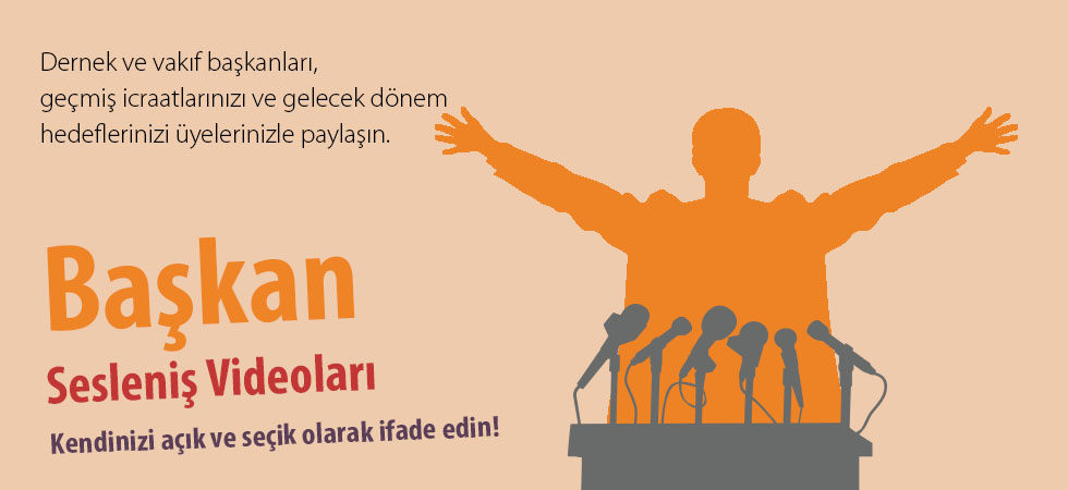 Dernek ve vakıf başkanları için geliştirilen bu video sunumlar ile, başkanlığınız dönemindeki icraatlarınızı ve gelecek dönem hedeflerinizi ilgilileriyle paylaşabilirsiniz.